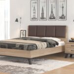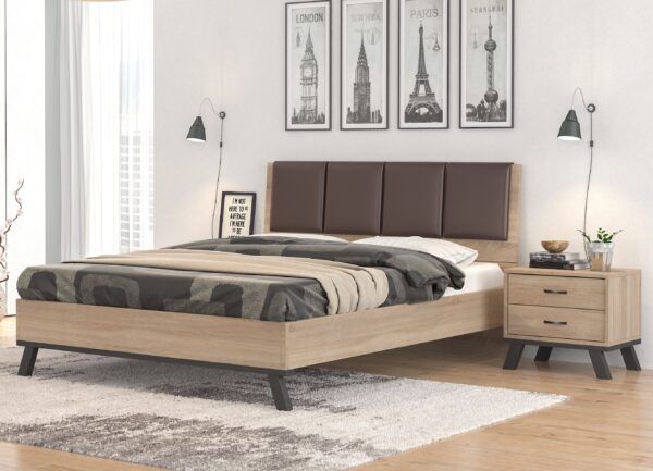 Κρεβάτι ξύλινο από μελαμίνη και επένδυση δερματίνης στο κεφαλάρι και μεταλλικά πόδια.