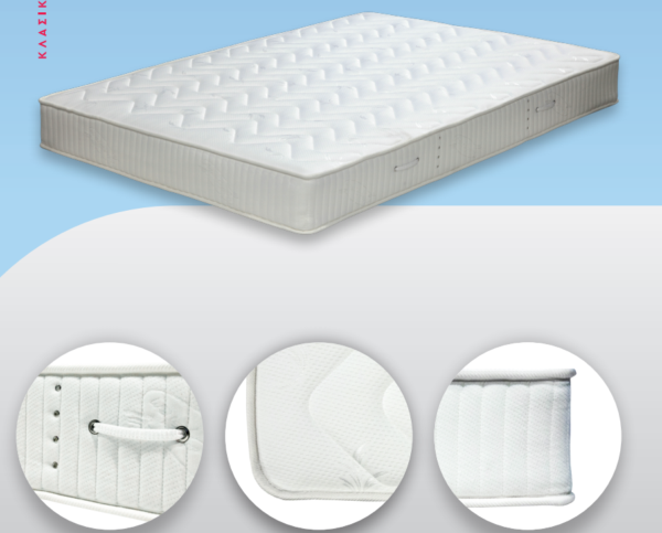 Ορθοπεδικό στρώμα με ελατήρια Bonnell Στρώμα με πλευρική στήριξη και ημίσκληρα ελατήρια bonnel πάχους 2,30mm. Η τριπλή στρώση γέμισης ανά πλευρά σε συνδυασμό με το πλεκτό ύφασμα προσφέρει επιπλέον άνεση. Χαρακτηριστικά:Ελατήρια bonnel 2.30mm 112/m2 Λαμάκι περιμετρικά Αφρώδεις κολώνες περιμετρικά Κετσές Ύφασμα non-woven Foam (αφρώδες) Βάτα Dacron 200gr/m2 Ύφασμα πλεκτό Πολλαπλοί αεραγωγοί Φερμουάρ