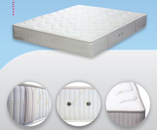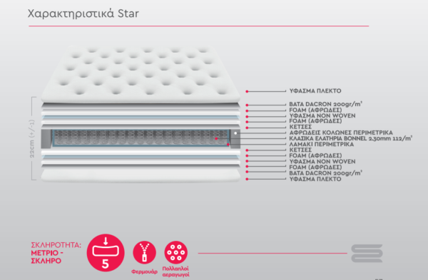 Ορθοπεδικό στρώμα με ελατήρια Bonnell Στρώμα με πλευρική στήριξη και ημίσκληρα ελατήρια bonnel πάχους 2,30mm. Η τετραπλή στρώση γέμισης ανά πλευρά σε συνδυασμό με ύφασμα Aloe Vera προσφέρει επιπλέον άνεση.Χαρακτηριστικά Star: Ελατήρια bonnel 2.30mm/m2 Λαμάκι περιμετρικά Αφρώδεις κολώνες περιμετρικά Κετσές λευκός Foam (αφρώδες) Ύφασμα non-woven Foam (αφρώδες) Βάτα Dacron 200gr/m2